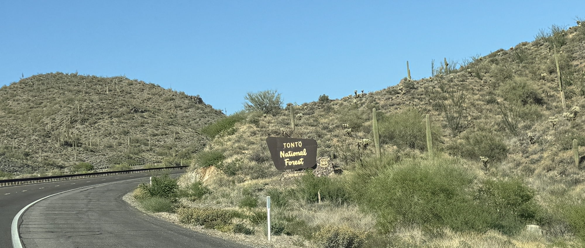 Off we went on a memorably beautiful, many-hours long drive into the Tonto National Forest. I spent about 13 years of an earlier time in my life in Arizona, but it still amuses me to no end that this desert area full of cactus and nearly no trees could possibly be referred to as a “forest,” and yet, it is. [Here’s its official website.]